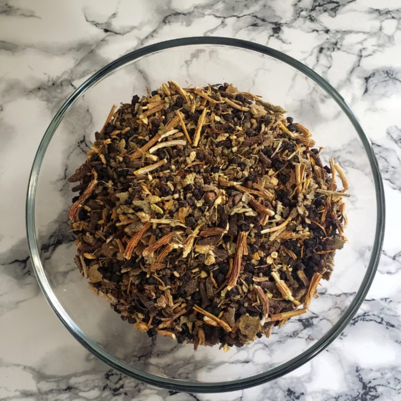 Elderberry, mullein leaf, sarsaparilla root, ginger root, cloves